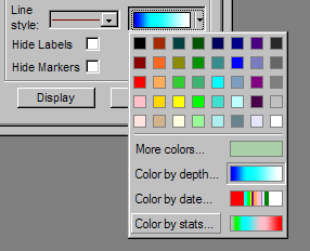 One of the choices will have a sunken appearance to indicate the selection currently in effect. In this example, "Color by depth" is currently selected and will remain so if this dialog is cancelled. (Clicking anywhere outside the dialog will cancel it.) Although the image at left doesn't show the mouse cursor, the raised appearance of the "Color by stats" button is due to the cursor being positioned above it. Clicking that button will open a dialog for editing a color range, or gradient. If the colored rectangle to the right of it is clicked instead, the gradient already defined for statistics coloring is directly selected and the dialog closes.