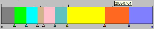 Another way of reducing the bar's range that's easier than a direct edit, is to 1) add a new peg by left-clicking an endpoint box and dragging inward with the left button held down, 2) reselect the corresponding endpoint box and delete it. The peg you added by dragging disappears, but its property value and color are passed on to the "deleted" endpoint peg. The endpoint color doesn't change but the value it represents does. The bar's range is thereby reduced and the resolution of the histogram improves. When the map is drawn, vectors that have values outside the gradient's range will be given the color assigned to the appropriate endpoint peg. A variation on this method is to omit the deletion step (2) that improves the histogram' resolution. More likely, though, you'll be wanting to "zoom in" on the histogram. When choosing colors for a color-by-date gradient, for example, you might need to see separate spikes for two nearby dates.