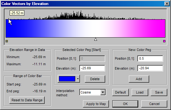 Mapping Colors to Survey Vector Properties When you use this dialog to define a color gradient, your goal will be to set it up so that the colors used to display survey vectors (or passage polygons) will reflect some vector property. The particular property is determined by the button you use to invoke the dialog and can be one of three types: elevation, date, or F-ratio. (Each of these types will be described in more detail below). In the dialog shown above, labels indicate that the property is elevation. Above the color bar is a histogram that shows the frequency of elevation values for vectors actually present in the data set. Here, the histogram covers elevations in the range -25.65 meters to -16.19 meters which have been linearly mapped to the gradient's position range (0.0 to 1.0). The yellow box with "-25.52 m" is what you see when you move the mouse cursor over a spike in the histogram representing an elevation of -25.52 meters. Every vector whose elevation falls within the color bar's range will correspond to a spike at least one pixel tall. Except for that condition, taller spikes correspond to larger proportions of vectors.