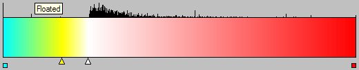 The large colored bar in this example represents a color range, which is calculated from the colors you assign to specific positions along the bar. The bar's left edge is at position 0.0 and the right edge is at position 1.0. You can assign colors to intermediate positions by creating one or more color pegs at appropriate points along the bar. The program will then calculate the colors for other positions using one of the interpolation methods described below. The cosine method illustrated here produces smooth color transitions between adjacent pegs. (The default method for depth coloring is HSL long, which can produce a good color range without intermediate pegs.) There is just one intermediate peg in this example, as indicated by the white triangular pointer -- white because that was the color assigned to it. You can create additional pegs in either of three ways: