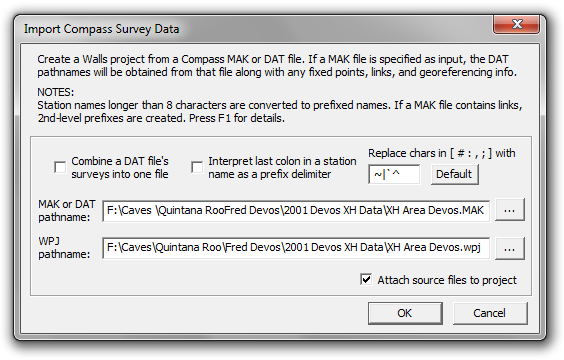 This function will process a Compass project (MAK) file to create a georeferenced Walls project incorporating data from many data (DAT) files. Besides the file names, the MAK file might contain the names and coordinates of fixed points, georeferencing info, and the names of connecting stations called links. The import function will also accept as input an individual DAT file, or multiple DAT files if an expression containing DOS-style wild cards (usually *.DAT) is entered for the source file name.