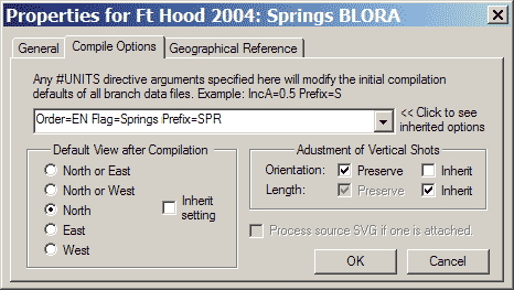 Inherited Options The Compile Options dialog (like the Geographical Reference page described below) illustrates the use of inherited options. In the example pictured above, orientation (verticalness) of pure vertical shots is explicitly set to "Preserve". The status of the length preservation option, however, is inherited from the parent node in the project tree. In this case, a grayed check mark reveals that a "Preserve" setting is being inherited. This facility allows you to control the processing of many surveys by accessing the Properties dialogs of just a few high-level book nodes. (A detached node does not break the inheritance chain.)