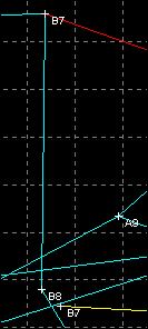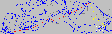 Graphical Review Once we highlight a traverse near the top of the list there are two routes to follow in discovering why its numbers are so bad -- possibly so bad as to be unprintable, in which case you'll see a set of dashes: "--.-". What I would probably do first is click one (or both) of the "FloatV/FloatH" buttons underneath the list box. This reprocesses the loop system and refreshes the displayed statistics; the respective components of the traverse are effectively thrown out. Immediately after this I would click the "Zoom" button to display the dialog's Map page homed in to the floated traverse. Shown in yellow is the uncorrected raw traverse as it was originally measured. Shown in red is the traverse as it would now be seen on a printed map. The red version "floats" to fit the now independently adjusted network. If we had zoomed without floating first, we would see only a red adjusted version and the network around it would likely be distorted by its effect. After floating the worst (topmost) traverse in Paxton Cave and then zooming in to its profile, we would see something like this: