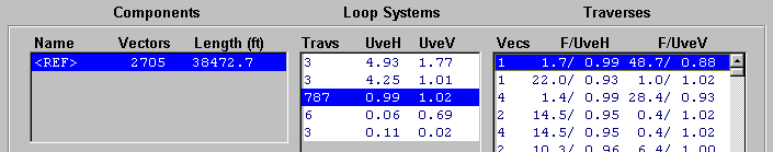 First, note that we've highlighted the cave's largest loop system, which has 787 total traverses and a vertical UVE (UveV) of 1.02. We've also selected the system's worst traverse, one that shows "48.7/ 0.88" in the F/UveV column. The top number (48.7) is the F-ratio, which measures the traverse's "agreement" with all other traverses in the loop system. A value of zero represents perfect agreement. A value of one is close to the expected agreement. In this case, F is much greater than one, which means that the system's vertical consistency will improve significantly if this traverse alone is discarded. In fact, UveV will drop from 1.02 to 0.88 (the number beneath the slash). If F had been smaller than one, detaching the traverse would actually worsen consistency; the number beneath the slash would have been larger than 1.02. Hence the bottom number is what the new UveV will be after the traverse is discarded -- something we can immediately verify by clicking the "FloatV" button.