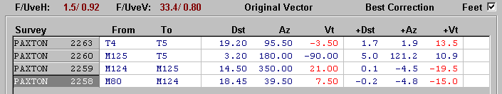 Here we see that three of four traverse vectors meet this criterion. Of the three inclination corrections that are highlighted, the last one in particular gets our attention: namely -15.0, which when added to the original 7.50 measurement amounts to a sign reversal. Of course we would examine the notes and sketch if they were available, but without them we strongly suspect that "-7.5" instead of "7.5" should have been recorded for shot M80 to M124. The other possibilities are less likely but can't be discounted entirely. For example, the second vector (M125 to T5) fails to meet our criterion for highlighting, but perhaps we should treat this pure vertical shot as a special case. Simply changing this vertical distance from "3.2" to "8.2" would eliminate the traverse's vertical misclosure while having no effect on horizontal consistency.