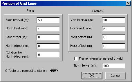 Grid intervals for plans are specified as an East interval in survey units and a North/East ratio. For initial compilations, the default East interval is 100 survey units and the North/East ratio is 1.0, which produces a square grid. In the above example, the "m" suffixes indicate that the current review units are meters (as specified on the General page of the Properties dialog). Similarly, profile grid intervals are specified as a vertical interval and a horizontal/vertical ratio. Here, the ratio 5 produces grid cells five times as wide as they are tall -- 50 meters wide in this case. Thus the grid dimensions of profiles are independent of the view direction.