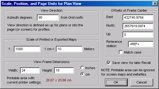 The Scale of Printed or Exported Maps section allows you to specify an exact scale in either of two ways: as a scale ratio or as a unit equivalence. Entering a number into either field will update the other field automatically. The scale, along with the view frame dimensions (see next section), will determine the view width in survey units. This width, in turn, defines the region shown in screen displays and in the Map Page's preview map. Note that page units, inches or centimeters, can be specified with a unit toggle in the next section of this dialog. The survey units, feet or meters, will have been determined prior to invoking the Review dialogs -- see Properties: General Page.
