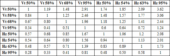 This table can be used to estimate one kind of position error statistic from another. To estimate a statistic on the top from a statistic on the left, multiply by the number in the cell where the corresponding column and row intersect. "Vt" in a label indicates that the statistic is the error of a single coordinate in length units, whether it be easting, northing, or elevation. "Hz" indicates that the statistic is the error in length units of a horizontal position. The percentages indicate the type of confidence region the length represents. These particular regions are often referred to as follows:
