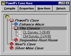 Detached Branches In this example, "Silver Mine Cave" is in a detached state. A detached item is skipped (ignored) during the compilation of either its parent or of an item closer to the tree's root. This means that if the root folder were to be compiled, and you were to review the results, you would seemk:@MSITStore:C:\Work14\bin\walls32.chm::/general_page.htm a network comprised only of Powell's Cave and Neel's Cave. As long as surveys have uniquely named stations, a successful compilation never requires that certain branches be attached or detached since a reviewable network can consist of more than one connected component.
