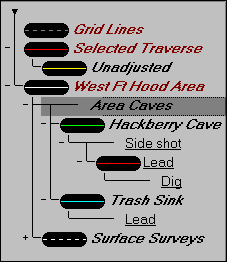 Notice that we are attempting to use one naming scheme for two basic types of attributes assignable to vectors: branch-type attributes that appear only once in the hierarchy (cave names, files, regions, etc.) and flag-type attributes that may be duplicated in many different parts of the hierarchy ("Surface", "Side shot", "Lead", etc.). The latter are analogous to the letter-designated shot "types" that are supported in other cave surveying programs.