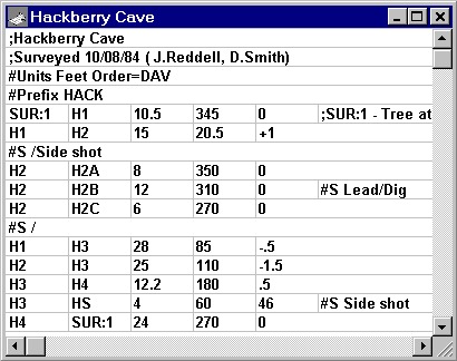 Below is a small survey (10 shots) as it would appear in a Walls editor window. Note that comments are prefixed with a semicolon. The grid lines in this window appear because the option to display tab characters as vertical lines is turned on. The Walls editor makes it very easy to use tabs to separate line items. (See Survey Text Editor.)