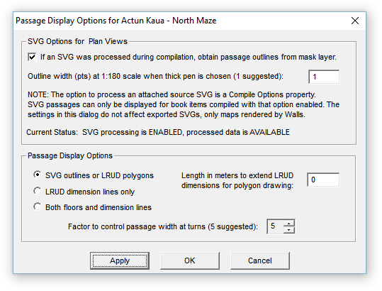 These options have no effect if passage drawing is not enabled on the Map Page (Passage check box), or if the compiled data set has neither processed SVG data or passage dimension data. The latter can be conventional LRUDs, LRUDs with a specified facing direction (no associated vector), passage wall shots, or a mixture of all kinds.
