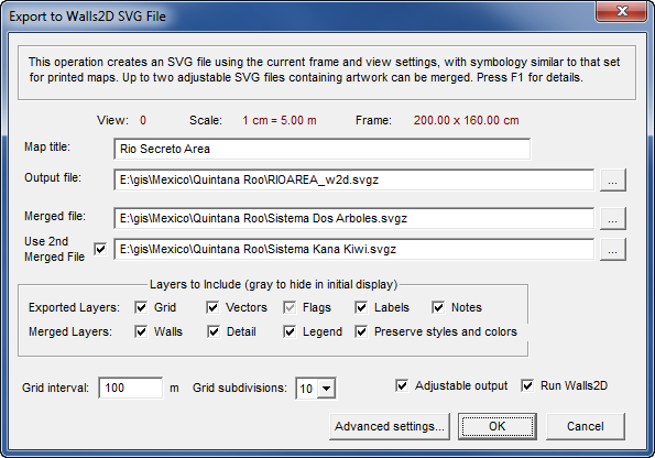 Merged Layers - Layers in the specified Merged file to include in the exported file. Walls will not only include those layers, but also adjust their content when necessary to fit revised surveys or a new map view. For a description of the Walls, Detail, and Legend layers, and the type of graphics they're expected to contain, see SVG Layer Descriptions. The check boxes for the Walls and Detail layers are tri-state and have the same effect described above for the Exported Layers. Users of Walls2D can control the visibility of each layer via a corresponding toolbar button. You must clear all three check boxes in this section to insure that no merge operation is attempted.