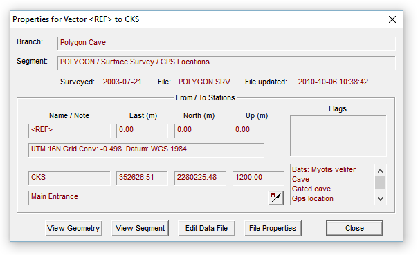 The window displays data retrieved from the compiled database. The red-colored text in the sunken rectangles can be scrolled horizontally, if necessary, and copied to the clipboard via a right-click context menu. The Branch field contains the location of the vector in the project tree. This location is expressed as a path-like name ending in the data file's title. (In this example, the data file for Polygon Cave is attached immediately beneath the tree's root so there are no higher-level name components.) The Attributes field contains the segment names assigned to the vector. Beneath the listed coordinates of each endpoint station is a long text field containing any note you may have assigned. In this example, since the from station is the UTM coordinate system's reference, datum and zone information is displayed instead of a note.